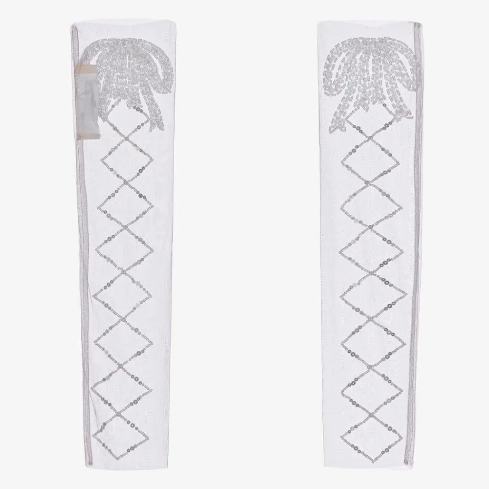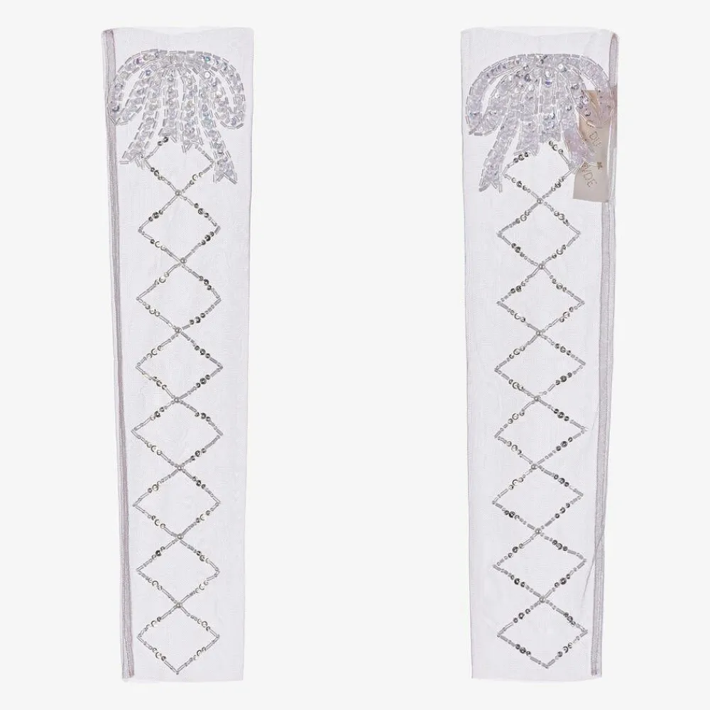 Girls pale pink leg warmers by Tutu du Monde, made in sheer, lightweight tulle. Accessorising her ballerina princess costume, these graceful leg warmers are beautifully embellished with silver sequins and iridescent beads for extra sparkle. Items are made to last and become more lovely with wear as slight fading and fraying edges adds to their charm.