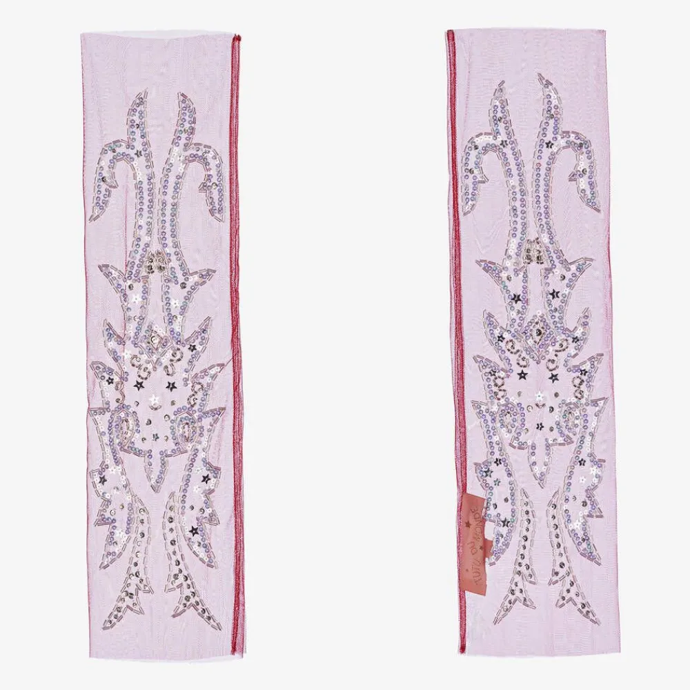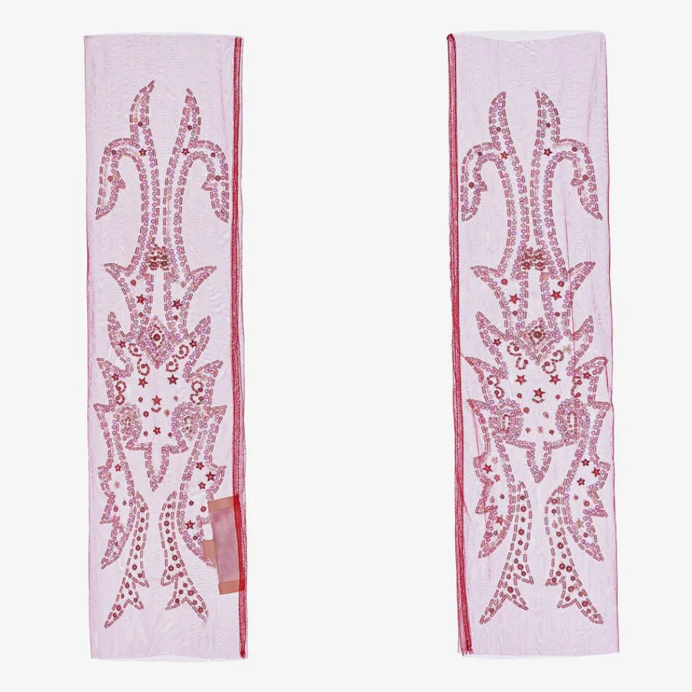 Girls red leg warmers by Tutu du Monde, made in sheer, lightweight tulle. Accessorising her stylish cowgirl costume, these sparkly leg warmers are beautifully embellished with silver sequins and beads. Items are made to last and become more lovely with wear as slight fading and fraying edges adds to their charm.