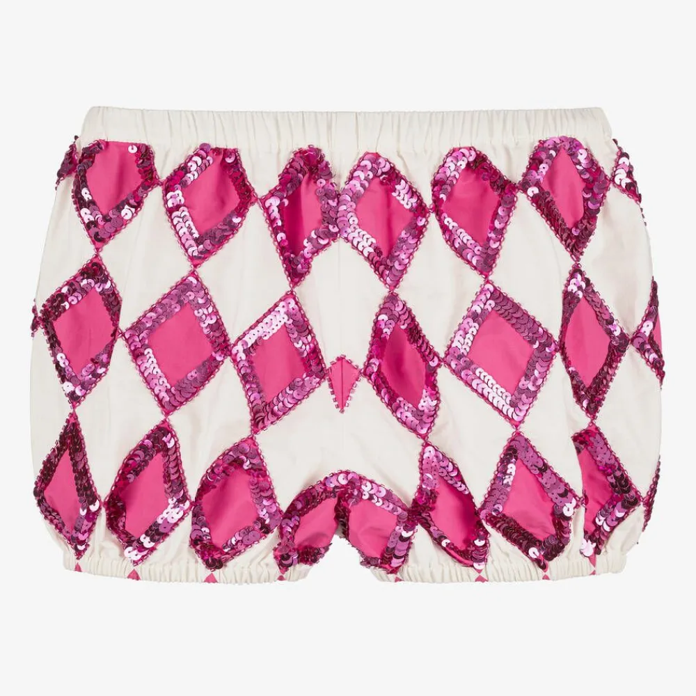 Eye-catching ivory Harlequin costume shorts for girls by Tutu Du Monde, with a fun balloon shape. They are made in soft cotton poplin with a bright pink diamond pattern, shimmering with sequins. Easy to wear, they simply pull up.