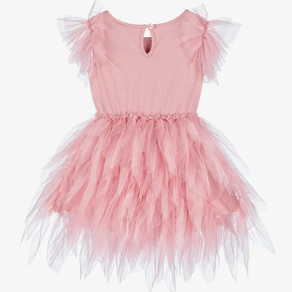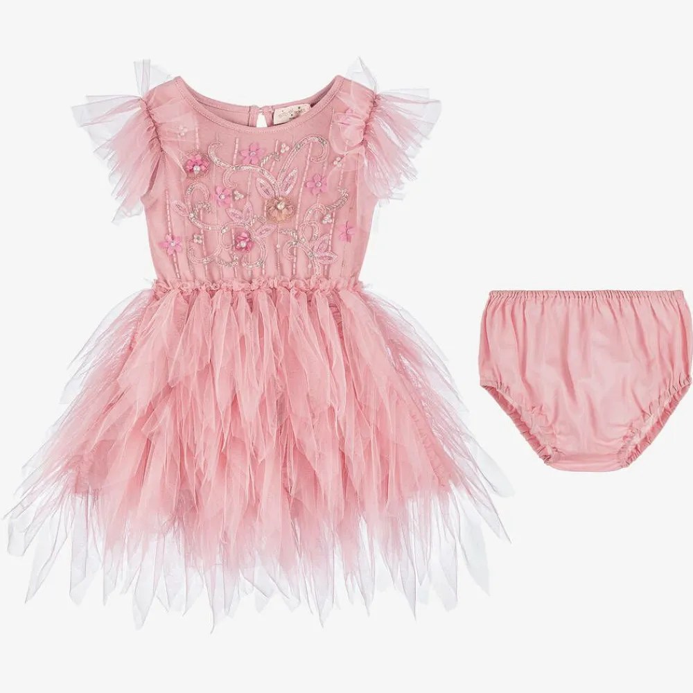 Pretty pink dress for baby girls by Tutu du Monde, hand-crafted in the finest tulle. The jersey bodice is hand-embellished with sparkling beads, faux pearls and tulle flower decorations for a beautiful look. Statement volume is created by the fabulous tutu skirt. Lined for comfort, it fastens with a pearlised keyhole button on the back. To complete the look, it comes with comfortable, elasticated knickers. Items are made to last and become more lovely with wear as slight fading and fraying edges adds to their charm.