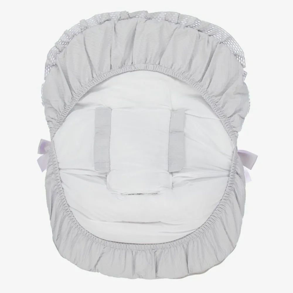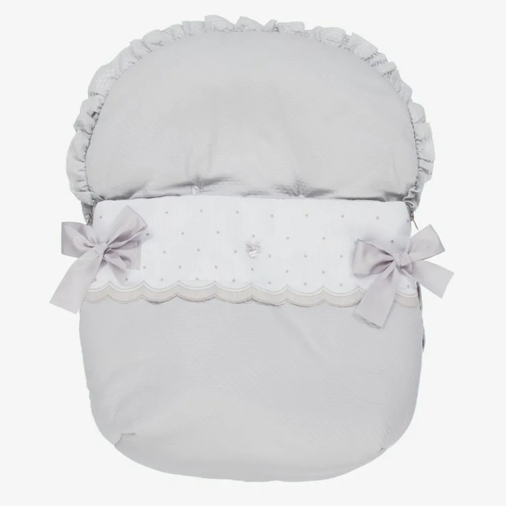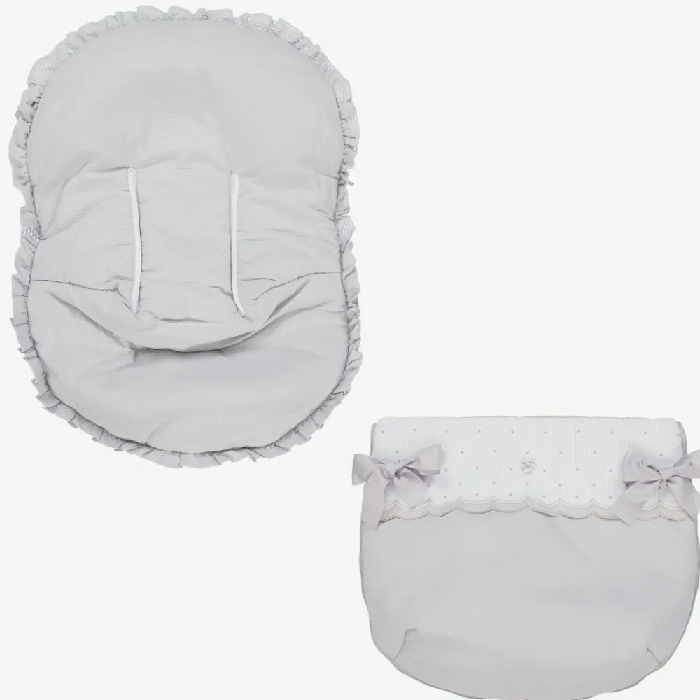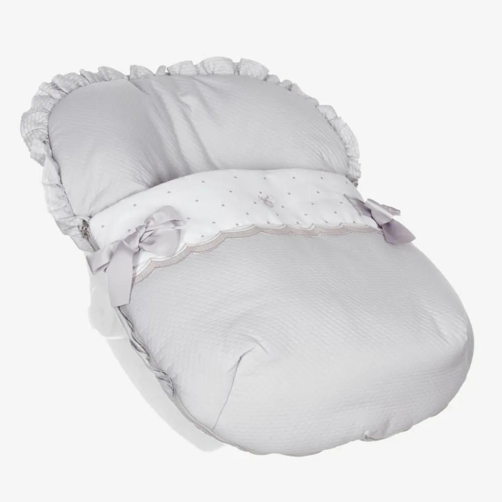 Padded light grey and white baby nest by Uzturre, ideal for use in the car seat. It has a white and beige polka dot design on the front with embroidered beige scalloped details, and tie-up grey grosgrain ribbons on the sides. With a pretty ruffle trim on the top, the front has zip fastenings on both sides for easy access. The backing hooks over the car seat and it has velcro fastening holes for shoulder straps.