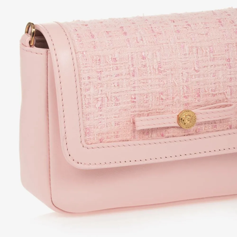 A chic pink leather shoulder bag for girls by luxury Italian brand Versace. Smart and sophisticated, it has tweed trim on the flap, woven with glistening sequins for a subtle sparkly touch. The designer's signature gold Medusa logo with a leather ribbon accent can be seen on the front and there is a gold logo print on the back. Just right for storing small essentials, the compartment is lined in soft cotton twill with a slip pocket and magnetic popper closure. A slim, adjustable leather shoulder strap attaches with gold metal clasps at the sides.