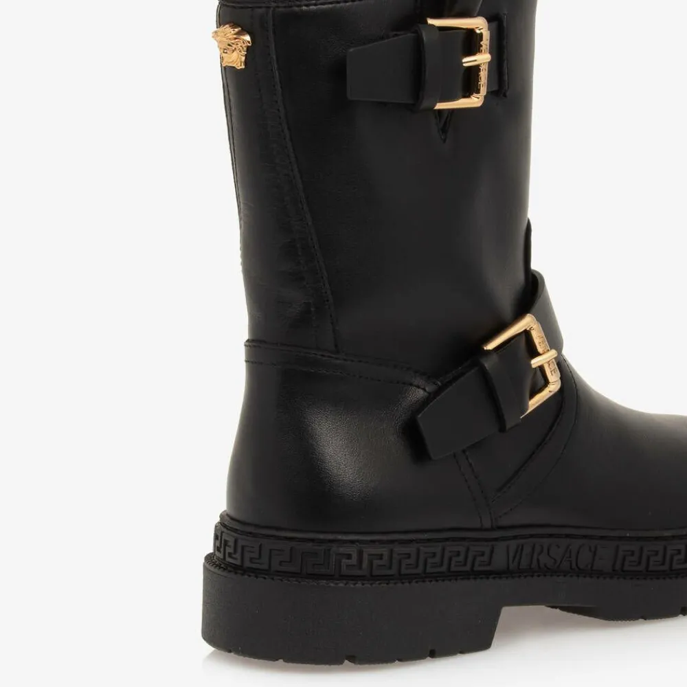 A cool and edgy style from Italian designer Versace, these black leather biker boots for boys and girls are trimmed with gold-hued, branded buckles. Medusa, the luxury brand's icon, is featured on the back and embossed Greca trims the midsole for that unmistakable designer look. The lining and insoles are leather for luxurious comfort and the non-slip outsoles are treaded with the House's well-known codes. The upper buckle can be unfastened to help slip the shoes on.