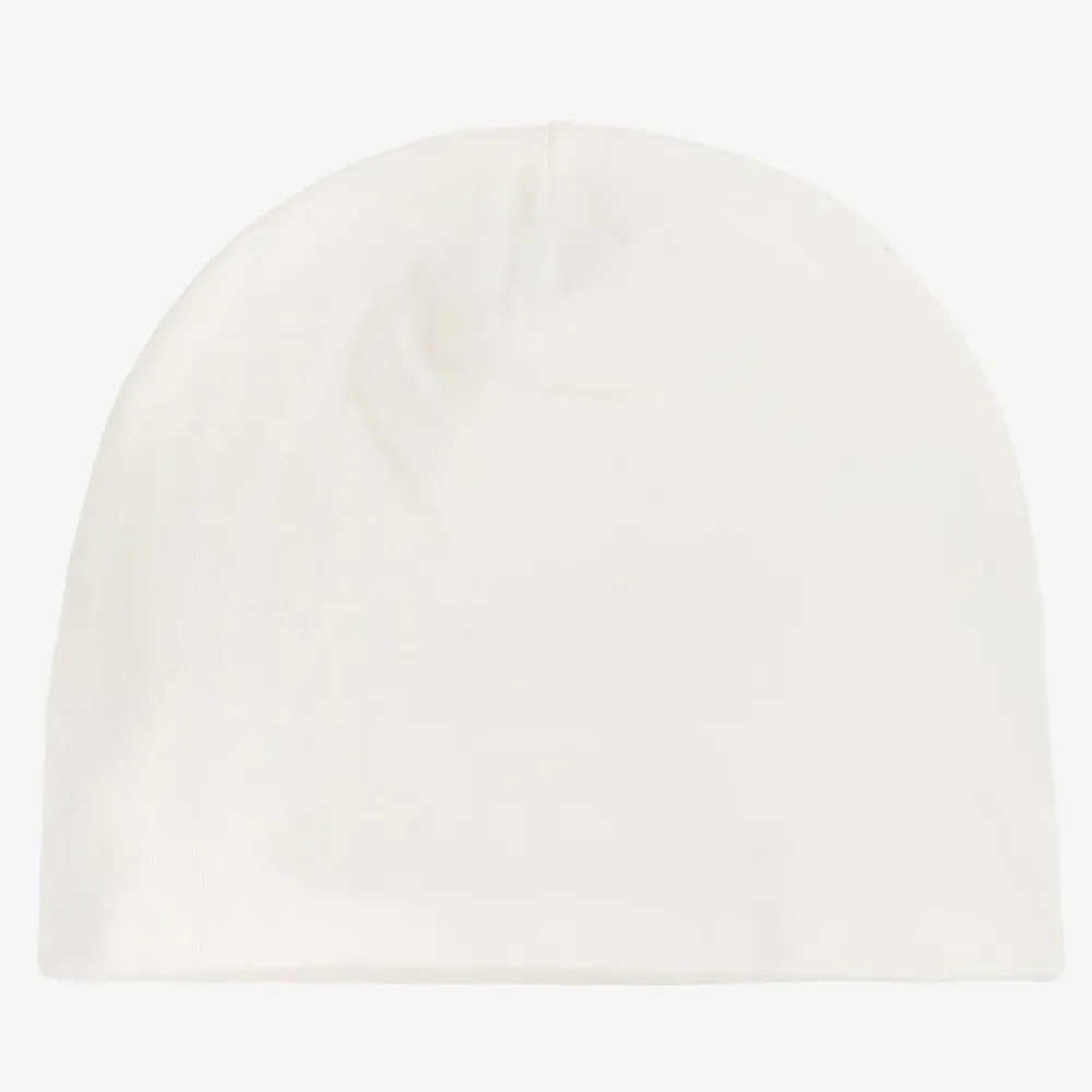 Luxuriously soft layette hat in off-white from Italian brand Versace for baby boys and girls. It is made in a double layer of soft cotton jersey, with a gold foil Medusa logo print.