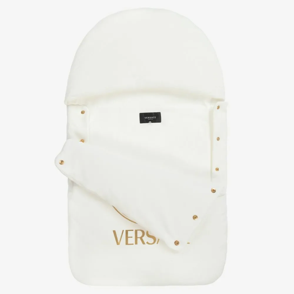 A soft and cozy ivory cotton jersey nest by Versace, suitable for boys and girls. Lightly padded, it has the brand's iconic Medusa logo printed on the front in gold foil. There are gold popper fastenings with matching Medusa emblems on both sides and a large snuggly hood.