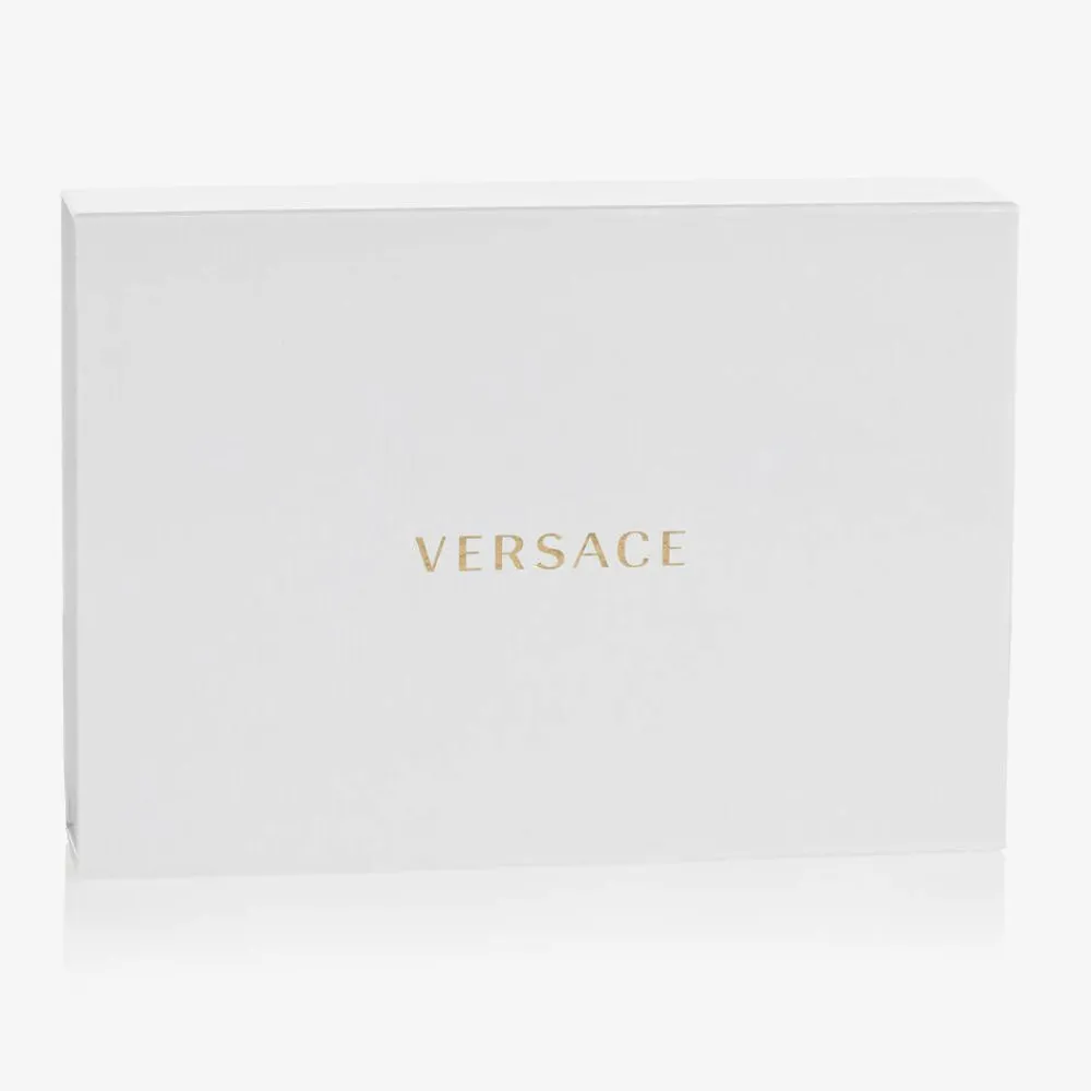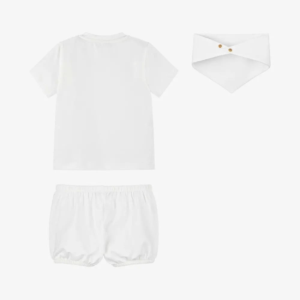 From luxury Italian designer Versace, an adorable off-white shorts set for baby boys. Made in soft jersey with light stretch for easy and comfortable dressing, this lovely set comes in a branded box making it an ideal gift for a new arrival. For a subtle designer touch, the top and bib are printed with tonal lace effect logos.