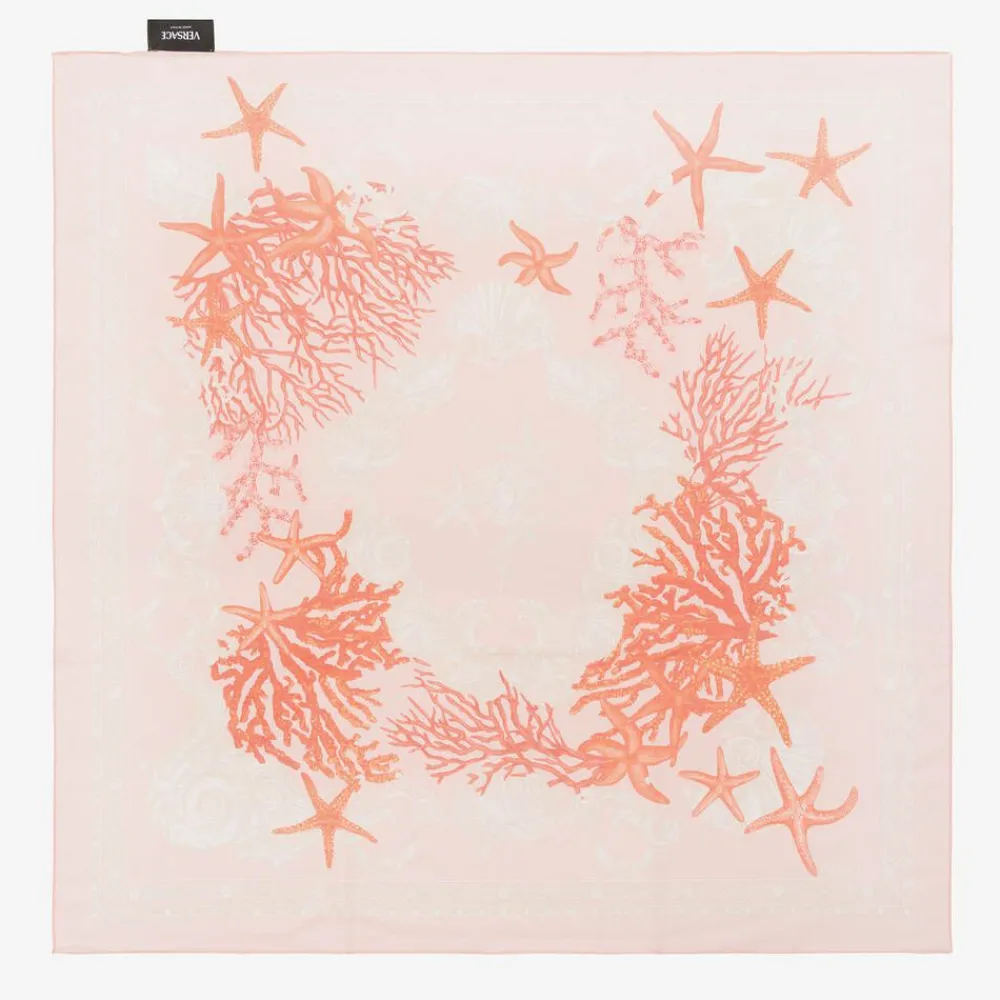 A gorgeous pale pink foulard for girls by luxury Italian designer Versace. Made in a sheer, lightweight, silk and cotton blend, it has a contrasting pink pattern of coral, shells and starfish, inspired by a print from the 2005 women's collection. Super stylish, it can be worn as a head scarf or around the neck as a bandana.