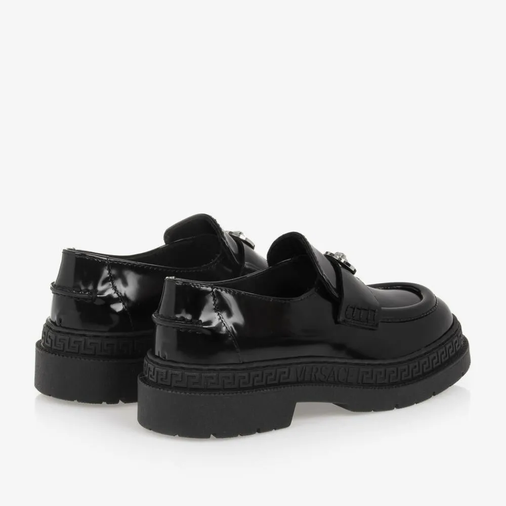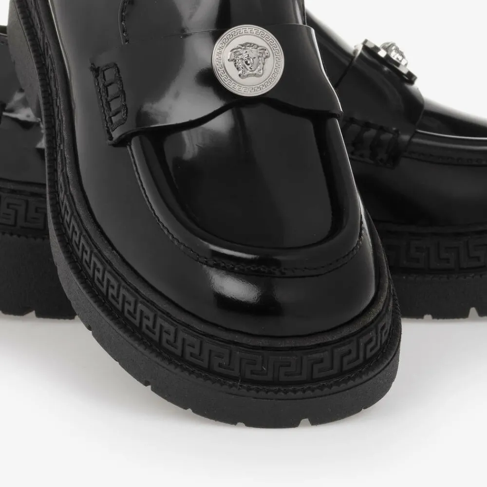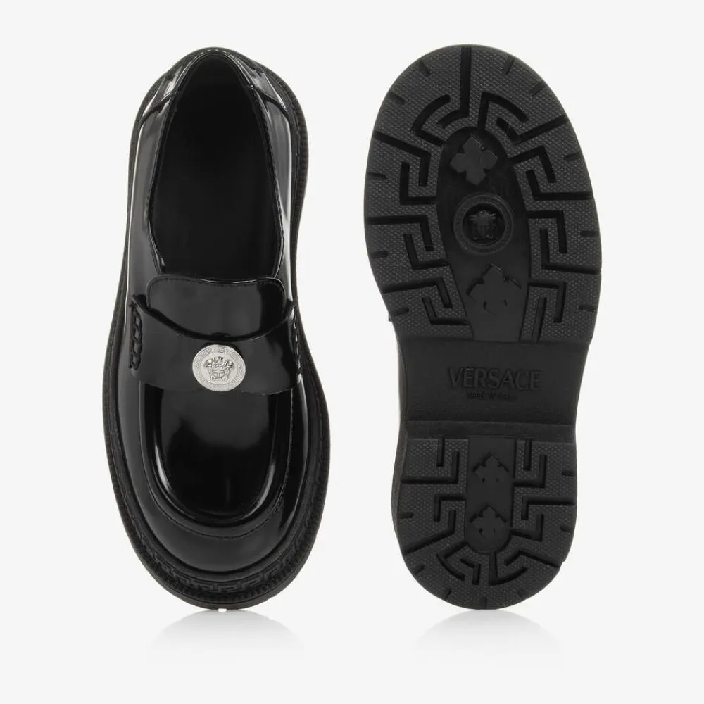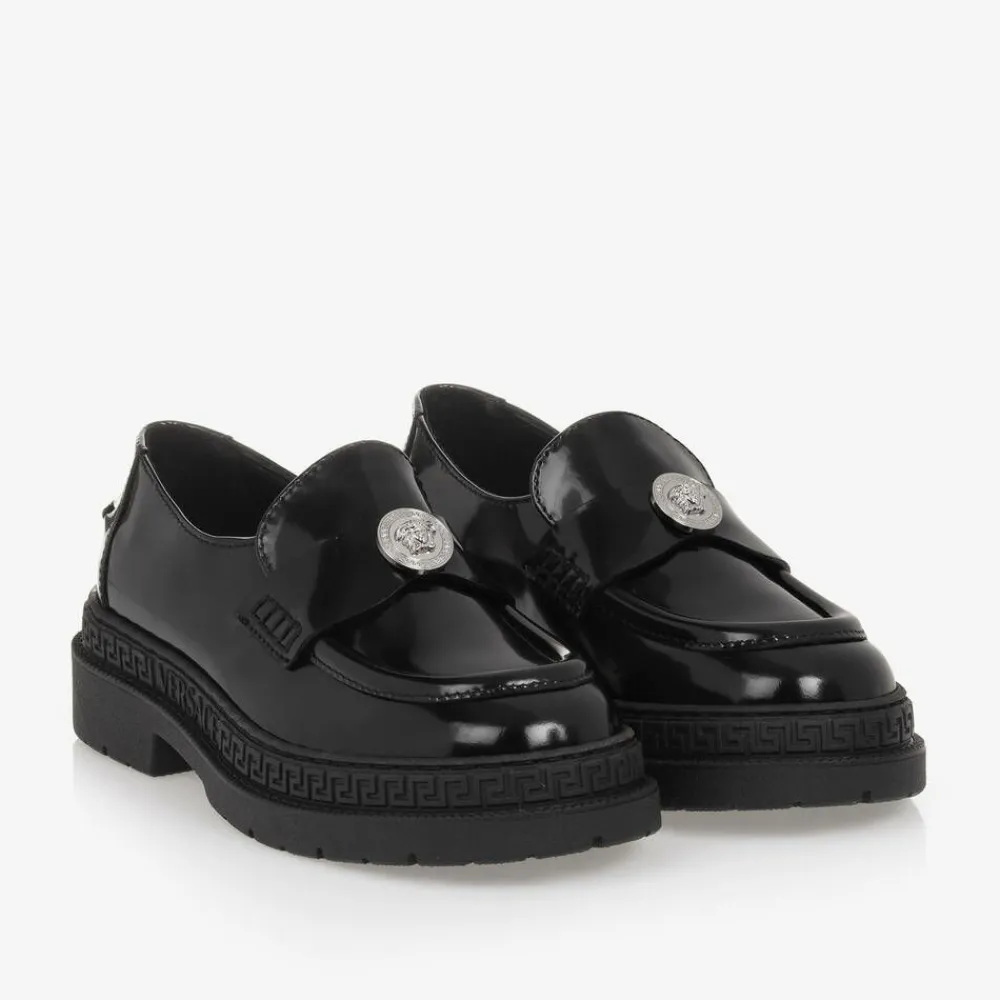 Smart and stylish black patent leather loafers for girls by Italian designer, Versace. Luxuriously smooth and glossy, they have a silver-tone Medusa medallion on the penny loafer strap, infusing the brand's signature opulence into this timeless style. Easy to slip on, they are fully lined in soft leather with a lightly padded insole for comfort. The recognisable Greca pattern is moulded on the mid-sole with further icons stamped on the ridged rubber outsole.