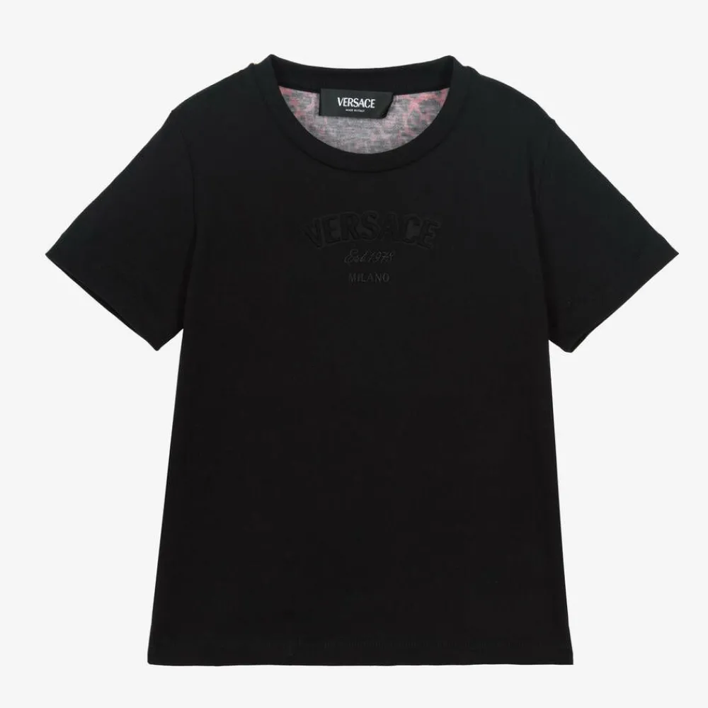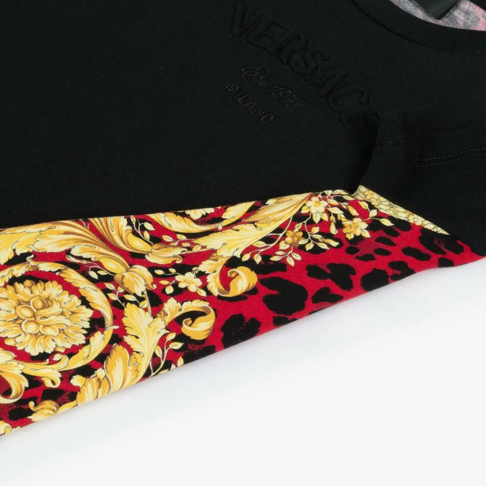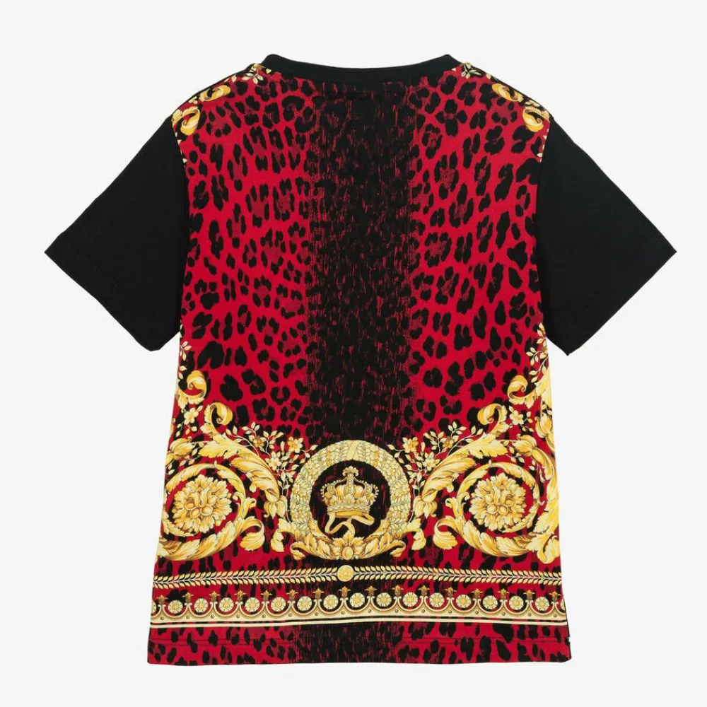 Inspired by the adult collection, this black cotton T-shirt for boys and girls is by luxury label Versace. This stylish top features the Italian brand's vibrant Wild Barocco print in gold and red on the back, for a stand-out, sophisticated look. It is made in soft jersey, with short sleeves and a lightly ribbed crew neckline and for an extra designer touch, it has a raised, tonal logo design on the front.