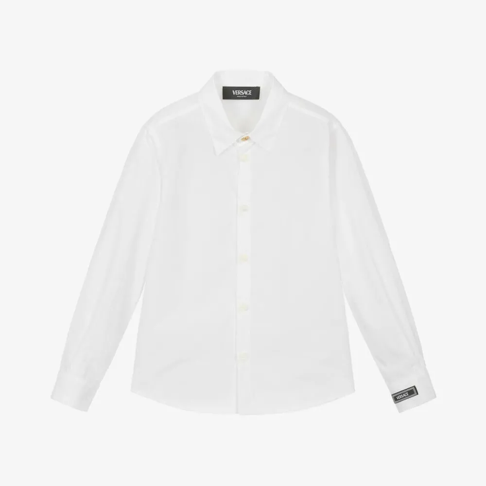 A smart white cotton shirt for boys by luxury Italian label Versace, featuring the brand's distinctive black logo patch on one cuff. Made from soft, lightweight poplin, this classic style is completed with gold-tone Medusa embossed buttons on the neckline and cuffs.