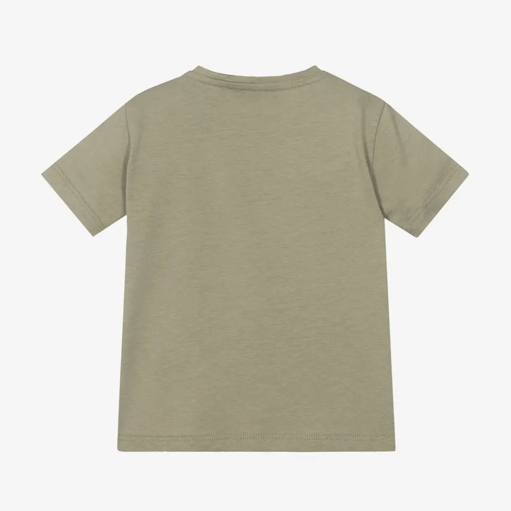 Khaki green short-sleeved T-shirt for baby boys and girls by Italian luxury designer Versace. For a distinctive look, the front is printed with a Greca framed Medusa logo in navy blue. Made in soft cotton jersey, this casual tee has a crew neckline and gold-tone poppers on one shoulder to assist with dressing.