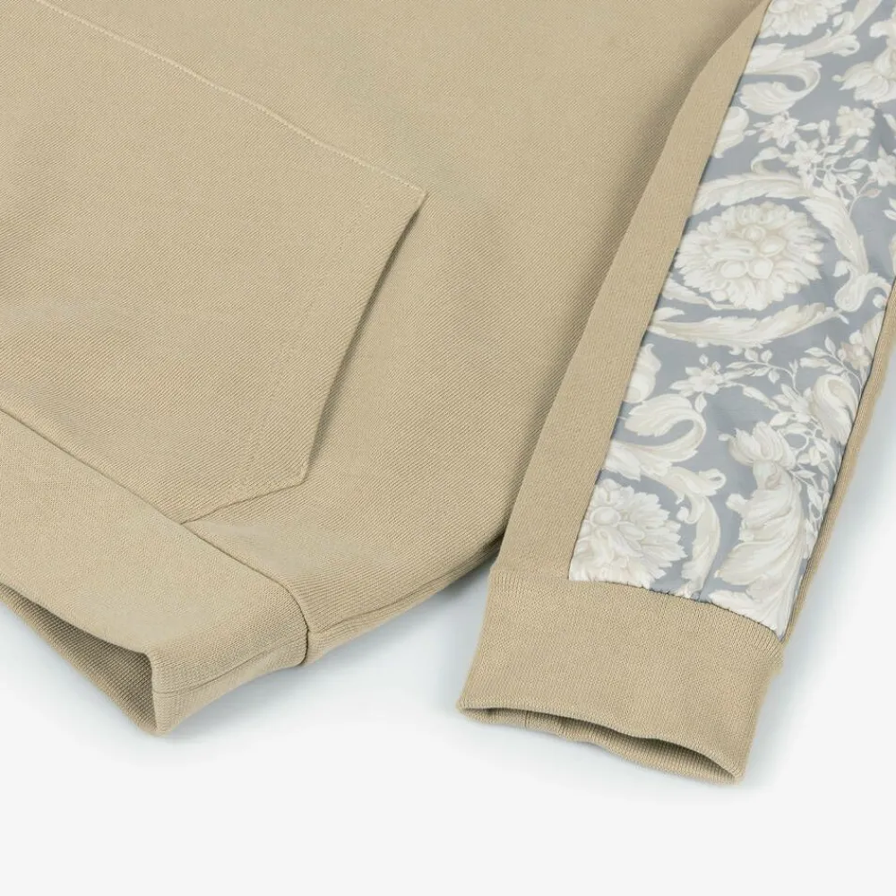 A stylish beige cotton hoodie for junior boys by luxury fashion house Versace, with tonal logo embroidery on the front. In soft hues of ivory and grey, the Italian label's signature Barocco print details the hood and sleeves for instant designer appeal. It is casually styled with a pouch pocket and made in soft mid-weight jersey for comfortable wear.