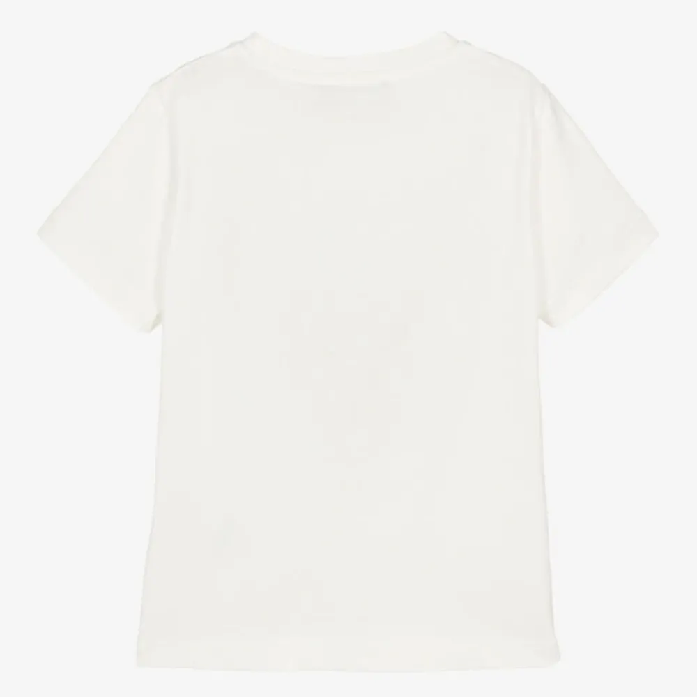 Inspired by the adult collection, this white cotton T-shirt for boys and girls is by luxury fashion house Versace. Unmistakably designer, the Italian label's logo can be seen on the front in a stylish, slightly textured leopard print for a distinctive look. Made in soft jersey for comfortable wear, it is casually styled with a lightly ribbed crew neckline and short sleeves.