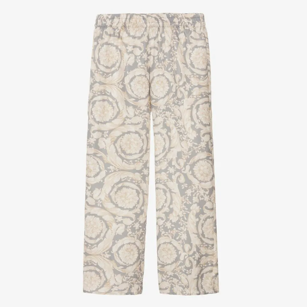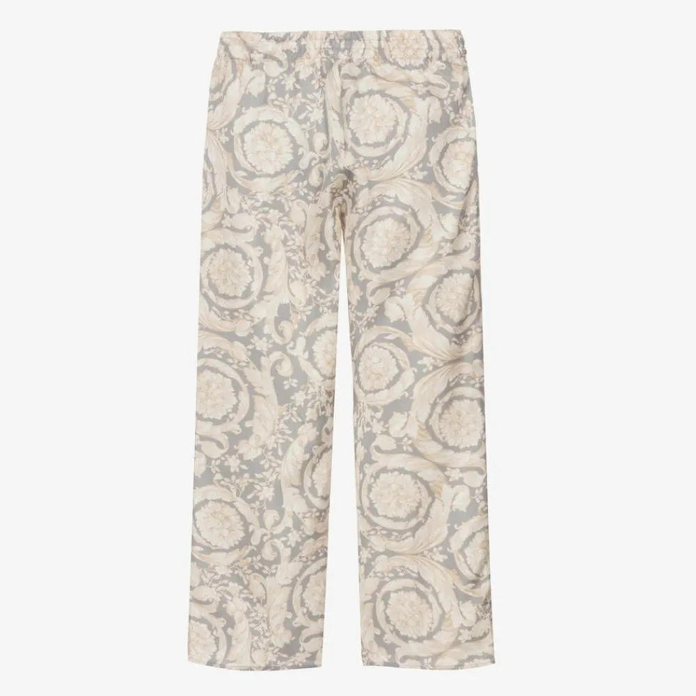 A pair of elegant, silk twill trousers for girls by luxury label Versace, patterned with the Italian designer's ornate Barocco print in soft hues of ivory and grey. Beautifully silky and lightweight, this timeless style has a stretchy elasticated waistband for a comfortable fit.