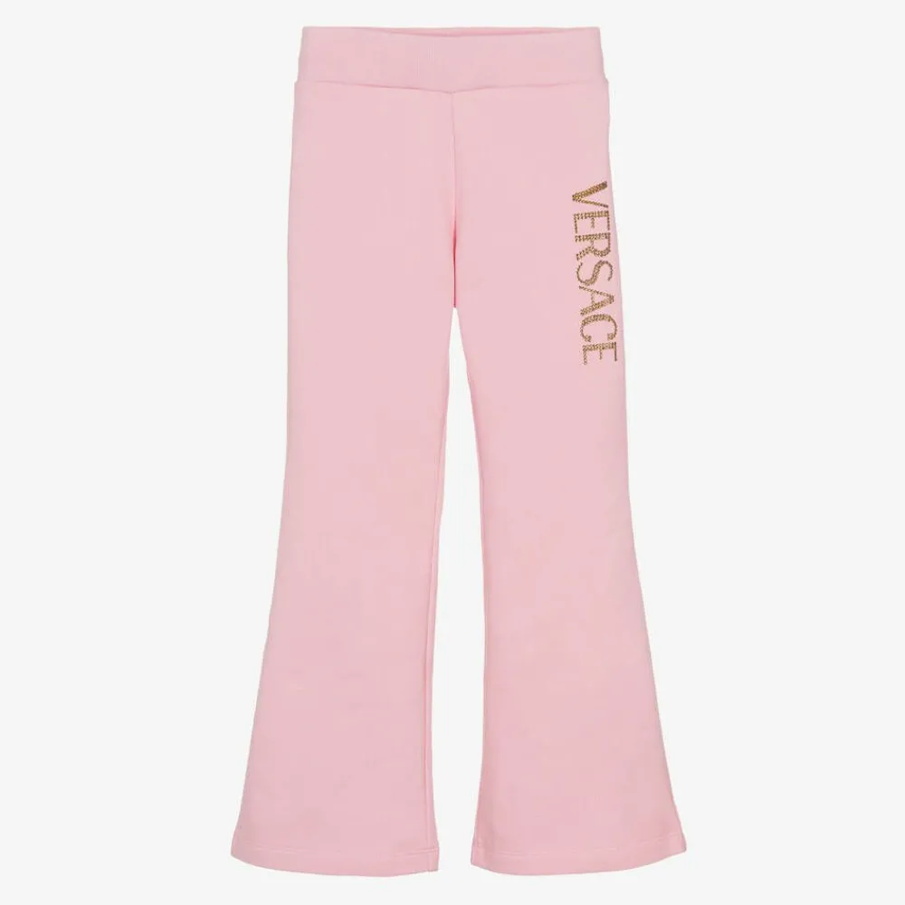 From Versace, a pair of pink cotton joggers for junior girls. Made in mid-weight jersey for comfort, these flared joggers have a diamanté logo on one leg for a sparkly designer finish.
