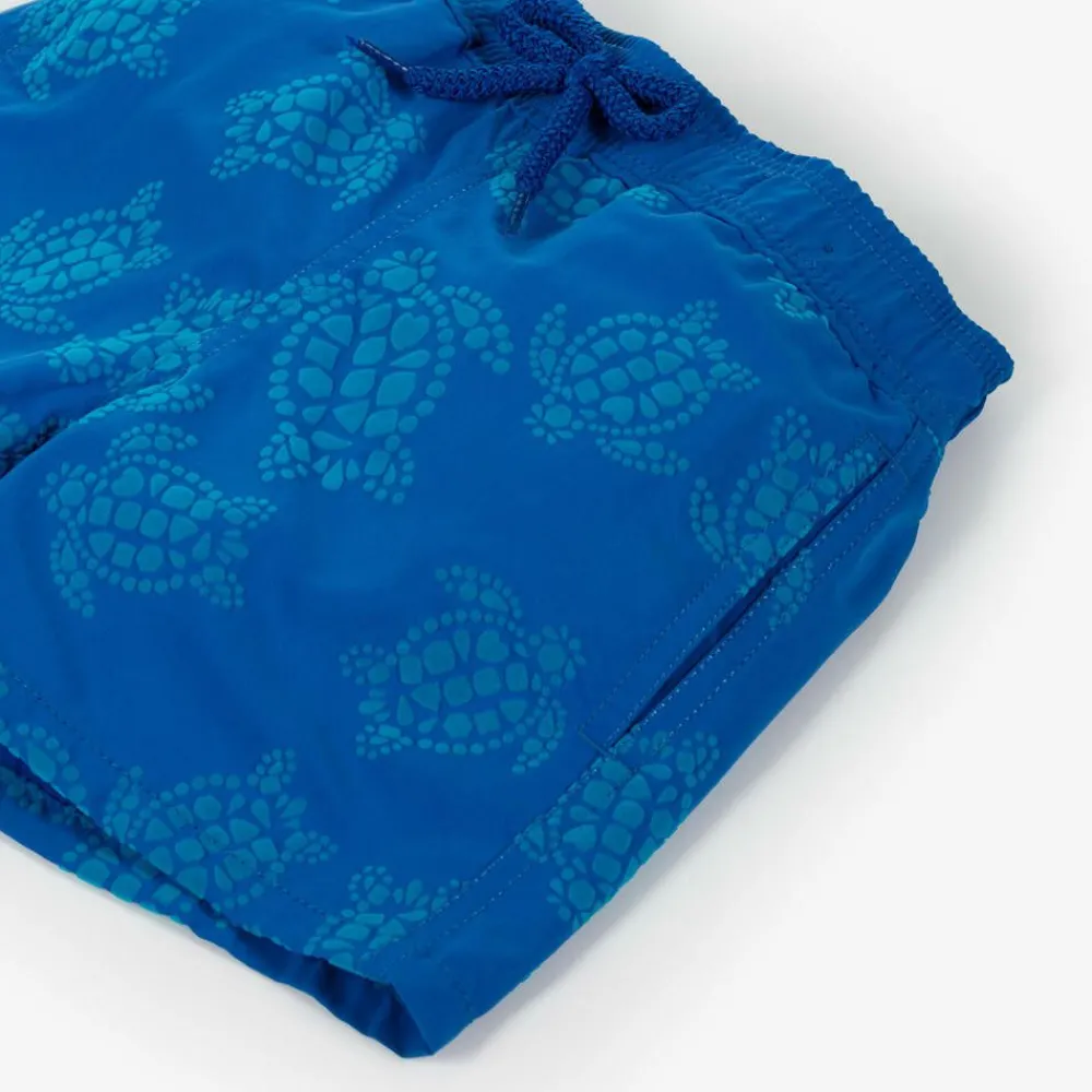 Bright blue swim shorts for boys by luxury label Vilebrequin. Super smooth with a lightweight mesh lining, they are patterned with a flocked turtle design for a fun seaside look. There is a velcro-fastened patch pocket on the back, a faux drawstring detail and logo patch on the adjustable elasticated waistband, and useful pockets hidden in the side seams.