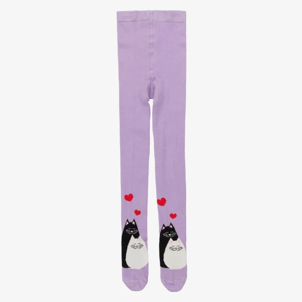 Purple tights for girls by Wauw Capow, made in a soft organic cotton blend with fine ribbing. Great for outfitting, these playful tights are detailed with cute black and white cats, and red love hearts. They have plenty of stretch for a comfortable fit and feel.