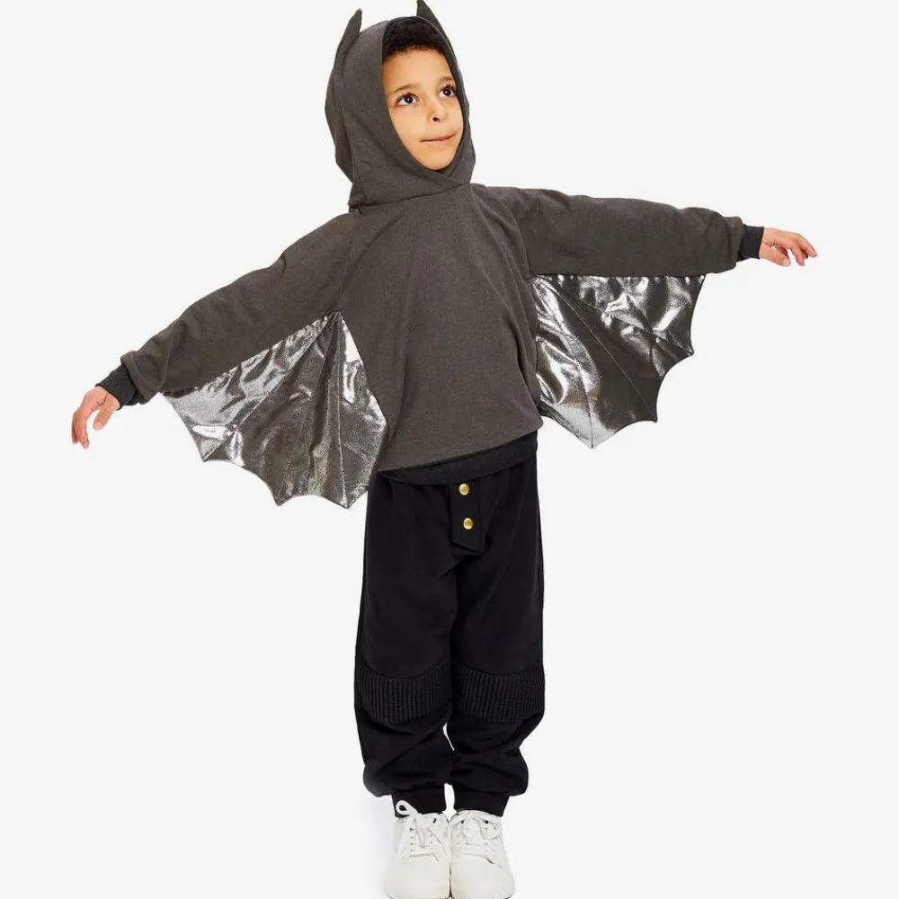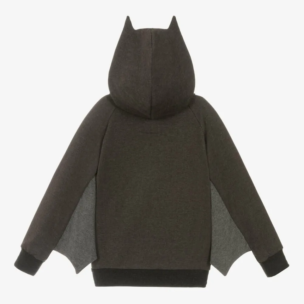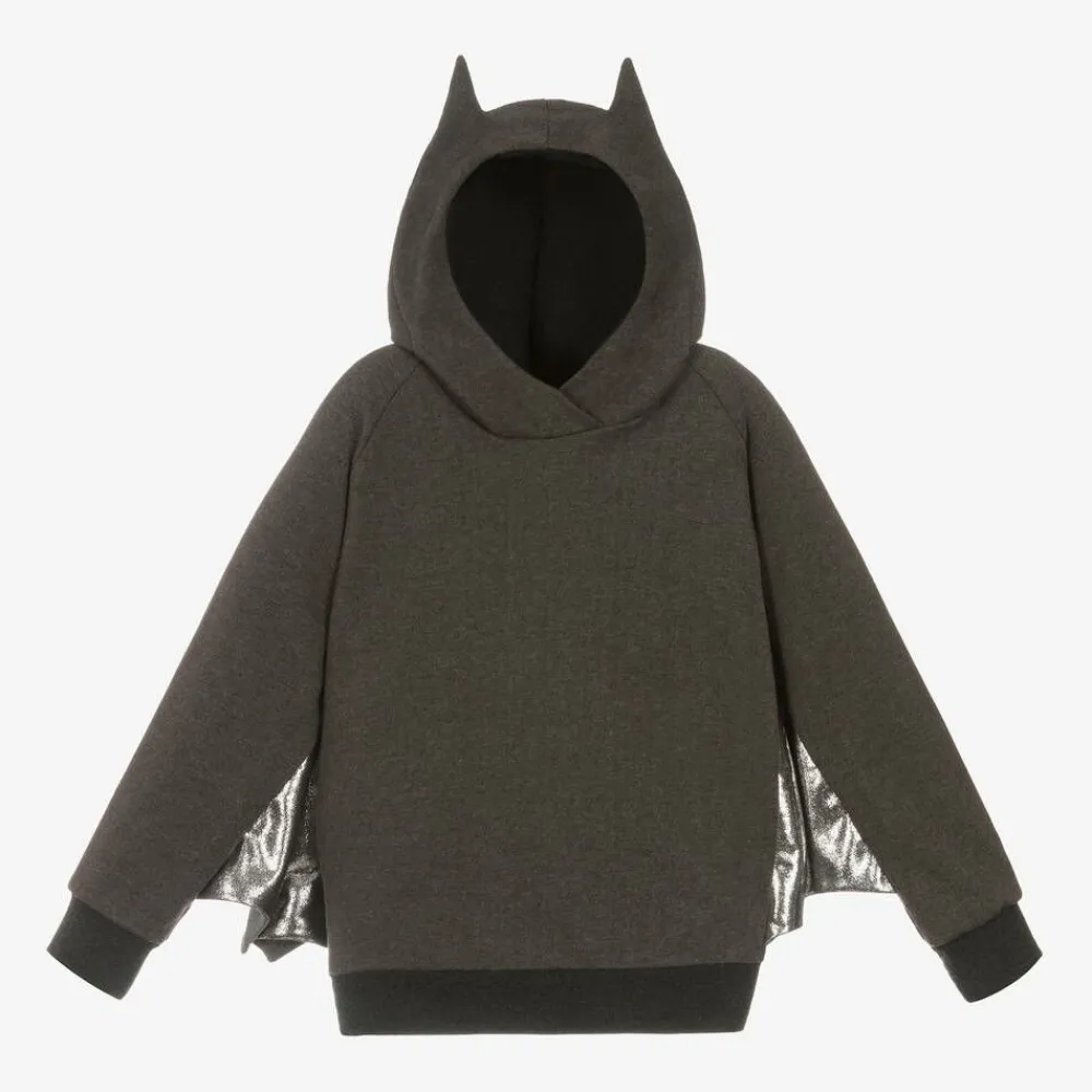 Fun, eye-catching dark grey hoodie for boys and girls by Wauw Capow. Cool for both trick-or-treating and casual play days, the lined hood has cute, 3D bat ears, and the sleeves have shimmery silver batwing panels for added fun. It is made from super soft, brushed jersey with cosy, black, ribbed trims.