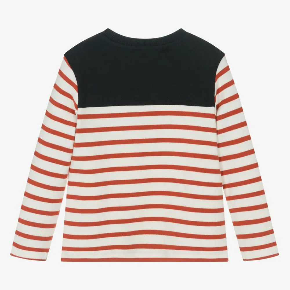 Red and ivory long-sleeved top for boys by Week-end à la mer, made in soft cotton jersey. This comfortable Breton striped top has a contrasting navy blue panel and a felted logo to catch the eye.